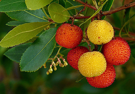 Il Corbezzolo (Arbutus unedo, famiglia delle Ericaeae), arbusto tipicamente mediterraneo, matura i suoi frutti proprio in questo periodo. E’ una pianta sempreverde, che cresce spontanea nei boschi e nella vegetazione dell’area mediterranea, con chioma espansa e spesso irregolare, costituita da foglie coriacee di colore verde lucido e margine seghettato. I fiori del corbezzolo sono piccole campanelle bianche, con lievi striature rosa, riunite in infiorescenze (racemi). Il frutto è una bacca tonda di colore variabile dal giallo, arancione, rosso; è un frutto morbido e rugoso, dal sapore dolciastro, da consumare fresco o trasformato in confetture.