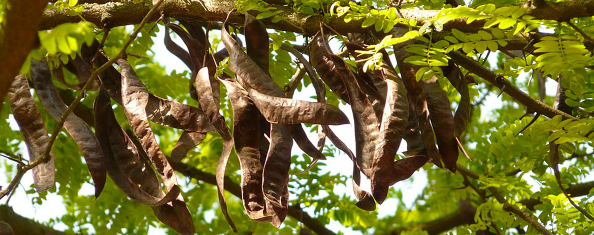 Il carrubo viene apprezzato per i suoi frutti, le “carrube”, baccelli allungati (fino a 20cm) e appiattiti, di colore marrone scuro. All’interno si trovano i semi, tondi e di consistenza coriacea, utilizzati nell’alimentazione animale. I semi sono avvolti in una scorza carnosa, dolce e ricca di fibre; ha proprietà lassative se viene consumata allo stato fresco, mentre diventa astringente se lasciata seccare. Provate a masticare una carruba per assaporarne il gusto dolce e aromatico, attenzione però a non masticarne i semi durissimi!