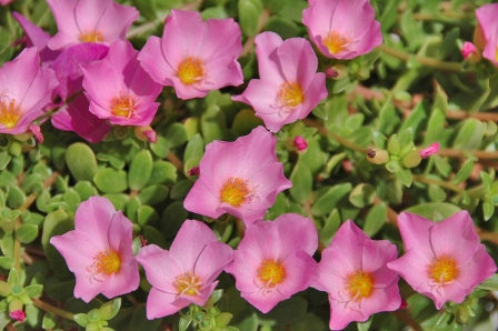 Drosanthemum floribundum: tappezzante, rustica, resistente alla siccità e alle basse temperature (qualche grado sotto lo zero). Raggiunge un’altezza di 5-10 cm. In primavera regala una fioritura molto appariscente. I fiori di colore rosa ricoprono tutta la pianta per circa due mesi. Ideale per giardini in posizioni costiere;