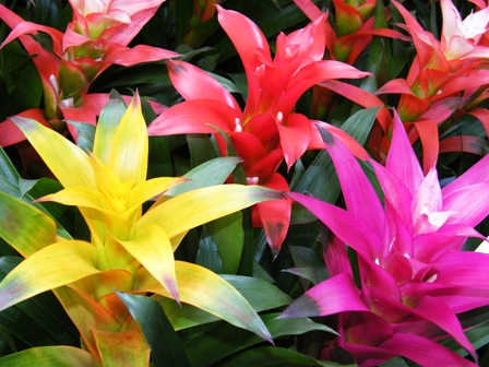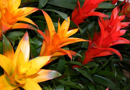Guzmania conifera, raggiunge anche il metro di altezza. In estate si sviluppano delle grandi infiorescenze con delle brattee rosso dagli apici di colore arancio.