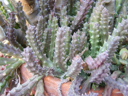 Stapelia glabricaulis: fusti che possono raggiungere un’altezza di 20 cm. L’infiorescenza di colore bruno-porpora compare in prossimità della base dei fusti.