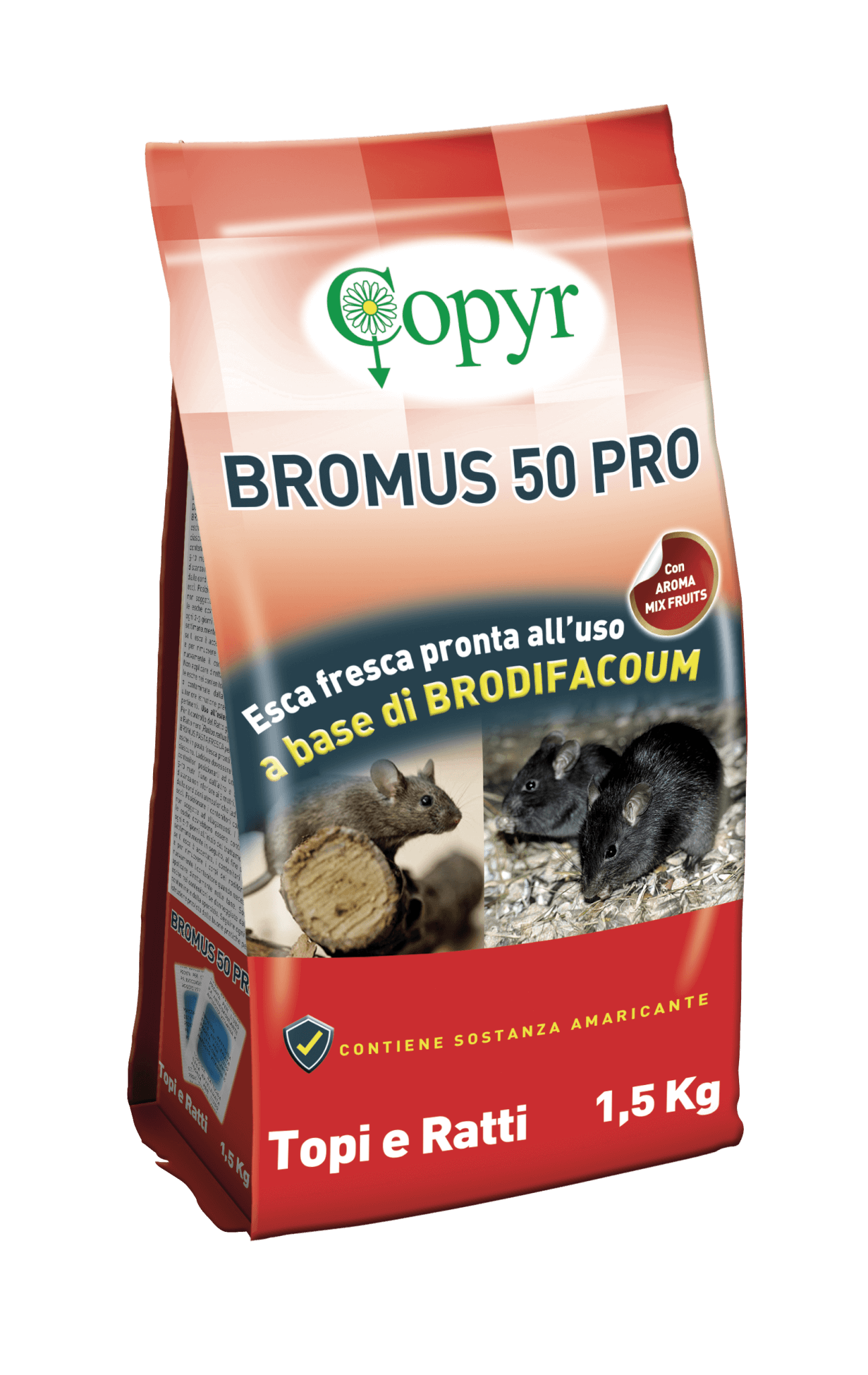 BROMUS PASTA FRESCA è un’esca rodenticida pronta all’uso a base di una sostanza attiva anticoagulante, denominata Brodifacoum, efficace contro Topolino domestico (Mus musculus), Ratto grigio (Rattus norvegicus) e ratto nero (Rattus rattus), anche dopo una singola ingestione. La formulazione consiste in una pasta fresca appetibile per le specie di roditori indicate. Il prodotto non allerta e non ingenera sospetti agli altri componenti della popolazione di roditori. BROMUS PASTA FRESCA contiene una sostanza amaricante atta a prevenire l’ingestione accidentale da parte dei bambini. BROMUS PASTA FRESCA può essere usato all’interno e intorno a edifici industriali (inclusi magazzini, depositi, stive delle navi), rurali, civili, abitazioni, cantine, garage, ripostigli, giardini ed aree esterne di pertinenza.