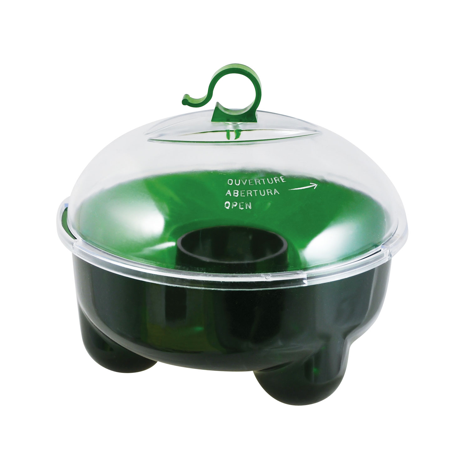Trappola a forma di campana in policarbonato e polipropilene, di colore verde, robusta e riutilizzabile, con via d’ingresso dal basso e gancio superiore di fissaggio. Si utilizza con l’attrattivo liquido concentrato a base di aromi alimentari e acido acetico in soluzione acquosa. Elevata capacità di cattura con una capienza utile di 2,4 lt. Di pratico impiego, può essere utilizzata sia appesa che posata, e con massima discrezione: gli insetti intrappolati non si vedono perché nascosti nella parte inferiore opaca. L’attrattivo naturale impiegato (privo di insetticidi) permette una lotta ecologica causando l’annegamento degli insetti intrappolati grazie a un agente stabilizzante e agli agenti tensioattivi presenti. Inodore (rispetto a esche in polvere che richiedono un tempo di latenza prima di agire), effetto immediato e resistente a qualunque temperatura. Grazie alla sua apertura inferiore orientata verso la luce, con un diametro studiato per evitare l’uscita degli insetti, cattura in maniera definitiva i principali insetti bersaglio: Vespula vulgaris (vespa comune), Vespula germanica (vespa germanica), Vespa cabro (calabrone) e Vespa mandarinia (calabrone gigante asiatico, predatore di api). Permette anche la cattura di mosche e moscerini presenti nei dintorni della trappola. Non attira le api.